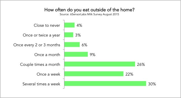 To that end, we wanted to understand how often people who monitored milk eat outside the home. People are eating out a couple times a month or more, more than 87 percent of the time, so this is not a group closed off to the outside world. Only 4 percent say they almost never dine out.