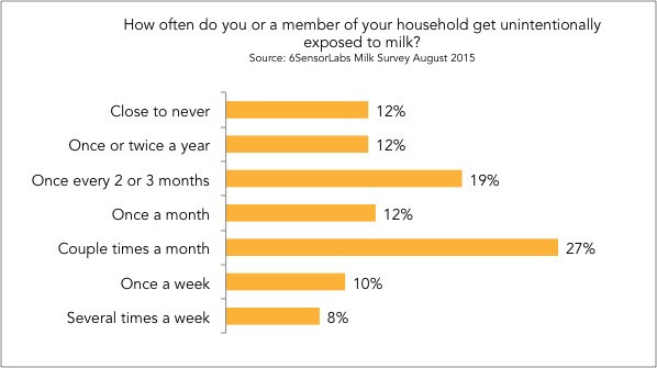 Forty-three percent of those who avoid milk and milk products and eat outside the home are getting sick once a month or more. Compared to people avoiding peanuts, the exposure rate is much higher (only 8 percent of people avoiding peanuts said they were getting sick once a month or more).