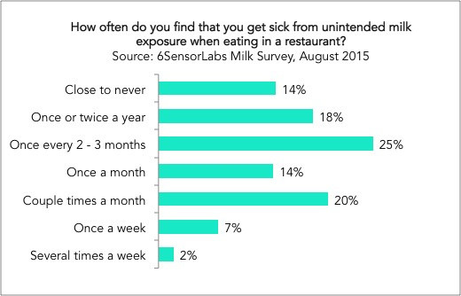 Compared to people avoiding peanuts, those avoiding milk are getting zinged way more often by unintended exposure. If you compare monthly exposure rates, 57 percent of people avoiding milk are getting hit at least once a month or more vs. 18 percent for those avoiding peanuts. We can speculate as to the reasons why. It could be that milk in the form of butter, sauces and other bases is just incredibly difficult to avoid in restaurant settings. Still, it’s a warning cry that so many get sick so often.