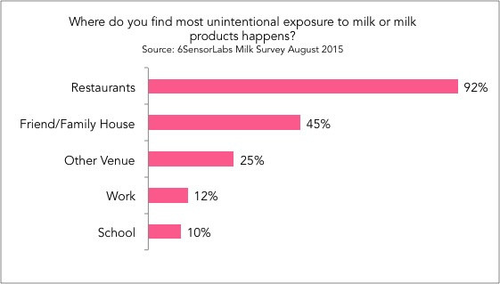 Even more so than peanuts, nine out of 10 respondents said unintentional exposure happens at restaurants, while friends/family members' houses are slightly less worrisome for folks avoiding milk. Items like sauces, bases for cooking and other items are making their way into people’s diets and causing adverse reactions.